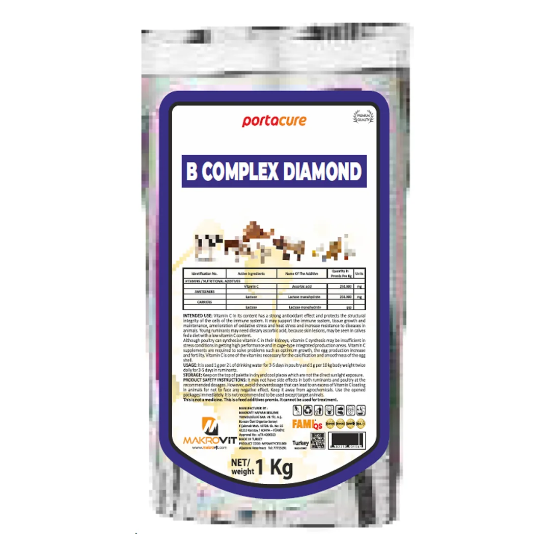 Kullanım Amacı: Gerekli B grubu vitaminlerinin ihtiyacını karşılamak, bağışıklık sistemini ve verimi desteklemek, sağlığı korumak, karaciğer yağlanması riskini azaltmak ve iştahı artırmak için kullanılır. B kompleks vitaminleri, hücrelerin düzgün çalışması için önemlidir. Karbonhidratları, yağları ve proteinleri metabolize eder, yemleri enerjiye dönüştürür, yeni kan hücreleri, koenzimler ve proteinler oluşturur ve sağlıklı deri hücreleri ile diğer dokuları korur. Vitamin B1, B2, B3, B5, B6, B7 ve B12 normal enerji sağlayıcı metabolizmaya katkıda bulunur. Vitamin B6 ve B12 bağışıklık sisteminin normal işlevine katkıda bulunur. Vitamin B6, normal protein ve glikojen metabolizması ile amino asit metabolizmasına katkıda bulunur. Biotin, Folik Asit (B9), Vitamin B12 ve B6 gibi B vitaminleri hücre fonksiyonu için hayati öneme sahiptir ve tırnak, saç ve cildin sağlıklı büyümesini teşvik eder. Kolin, L-karnitin ve Betaine, normal karaciğer fonksiyonunun korunmasına katkıda bulunur. Kullanım: Kanatlı hayvanlar için 1000 litre içme suyuna 100-250 gram ve 1000 kilogram yeme 250-500 gram karıştırılarak, geviş getiren hayvanlar için ise 1000 litre içme suyuna 50-100 gram ve 1000 kilogram yeme 500-1000 gram karıştırılarak kullanılır.
